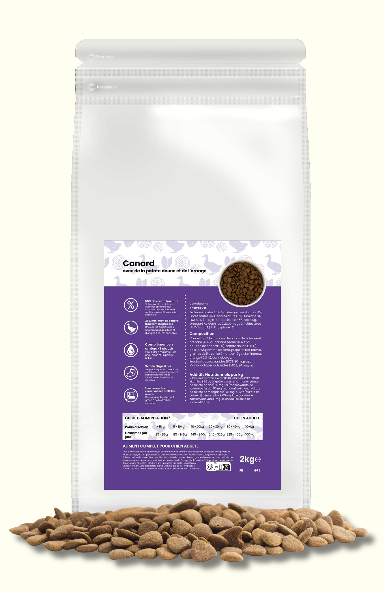 Canard 50% y compris du canard fraîchement préparé 28%, du canard séché 20% et du bouillon de canard 2%), patate douce (26%), pois (6%), pomme de terre, pulpe de bet terave, graines de lin, complément oméga-3, minéraux, orange (0,3%), canneberge,