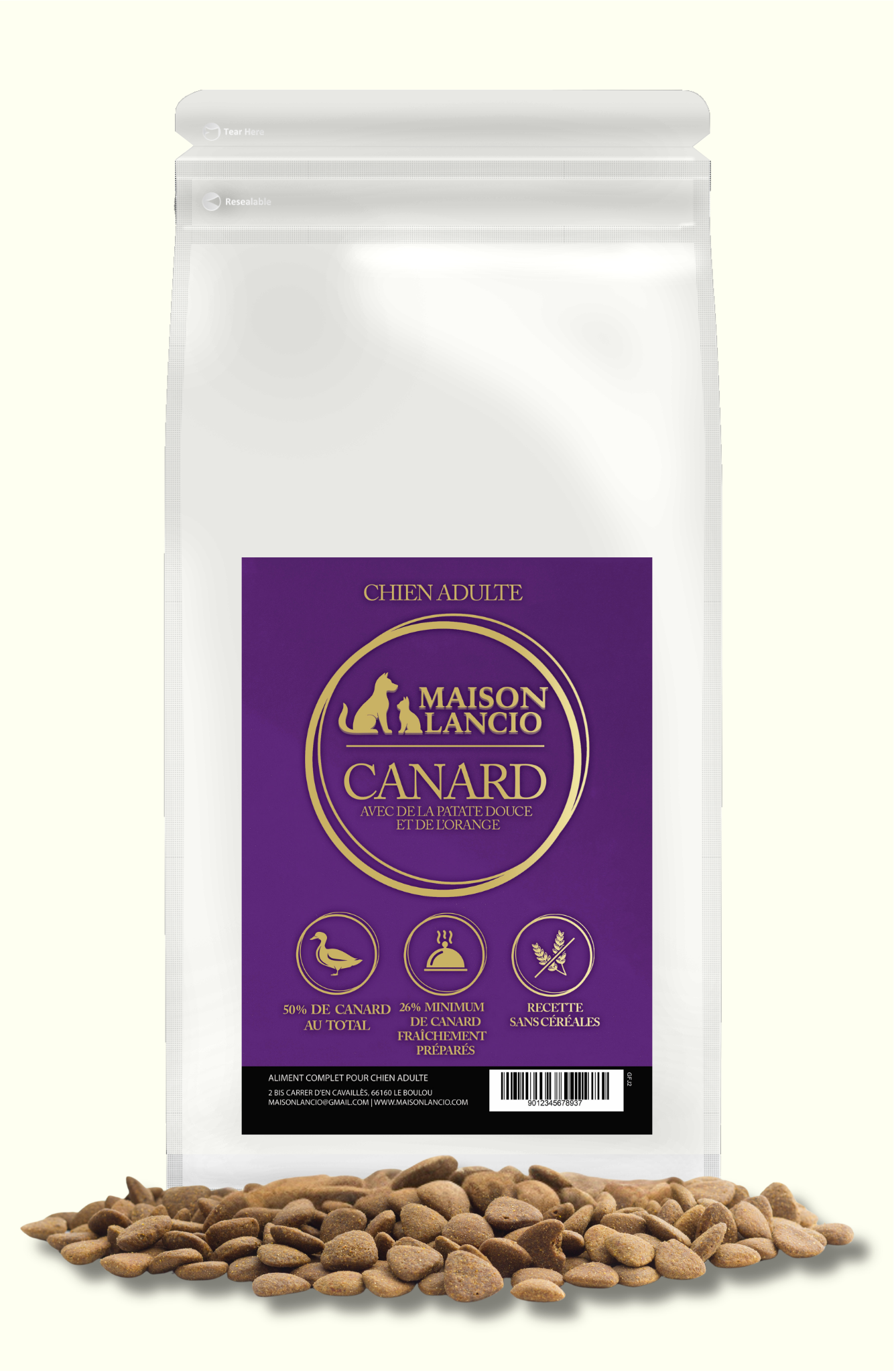 Élaborée à partir de canard soigneusement sélectionné, cette recette offre une alimentation savoureuse et hautement digestible, adaptée aux besoins des chiens adultes.