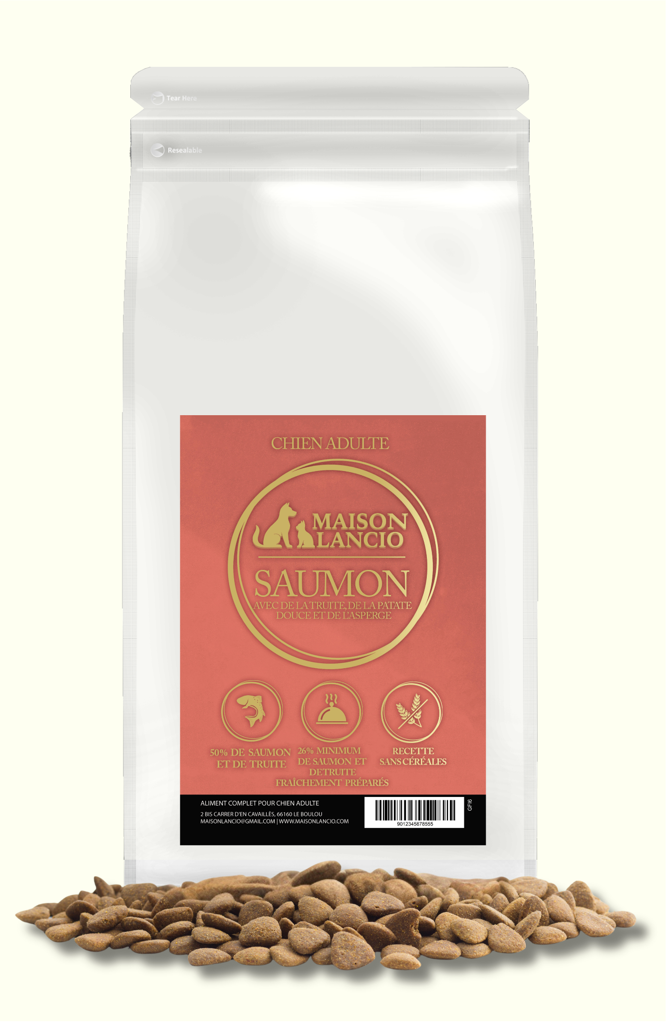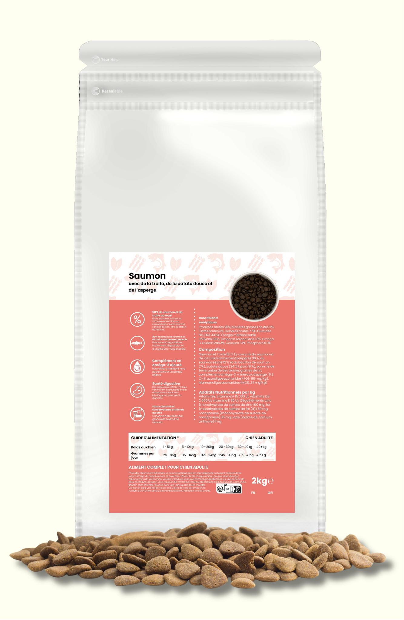 Cette recette associe saumon et truite soigneusement sélectionnés à des ingrédients végétaux fonctionnels pour offrir une alimentation à la fois appétente, digestible et adaptée aux besoins des chiens adultes.